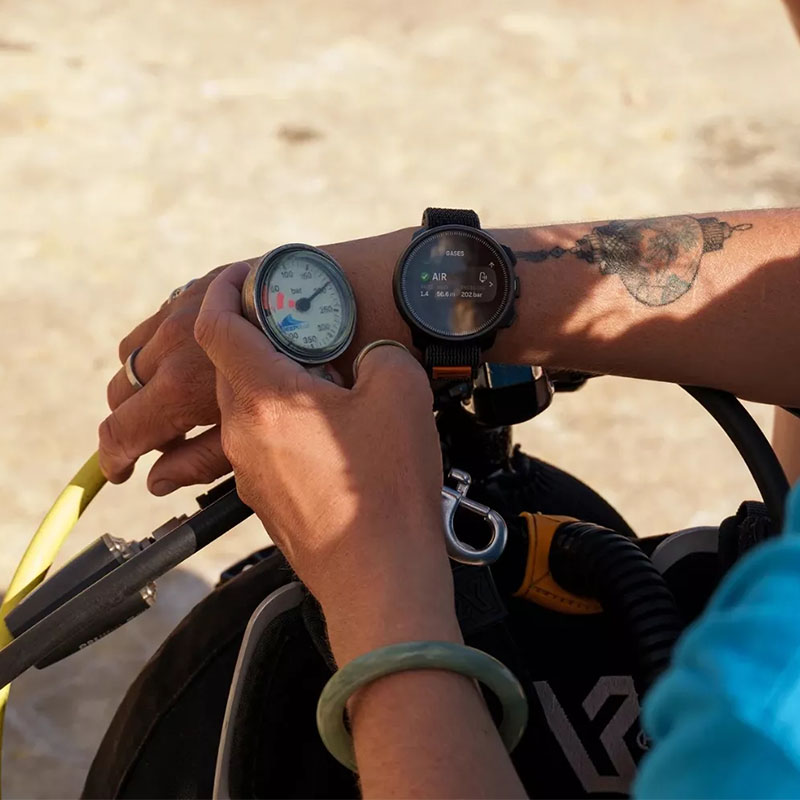 Możliwość bezprzewodowa kontroli ciśnienia w butli przy użyciu nadajnika Suunto Tank POD, z obsługą jednocześnie dwóch nadajników dla konfiguracji sidemount