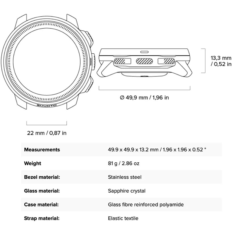 Komputer Suunto Nautic S jest wyposażony w wygodny, elastyczny pasek tekstylny o szerokości 22 mm, kompatybilny z innymi paskami Suunto z serii Ocean i Outdoor